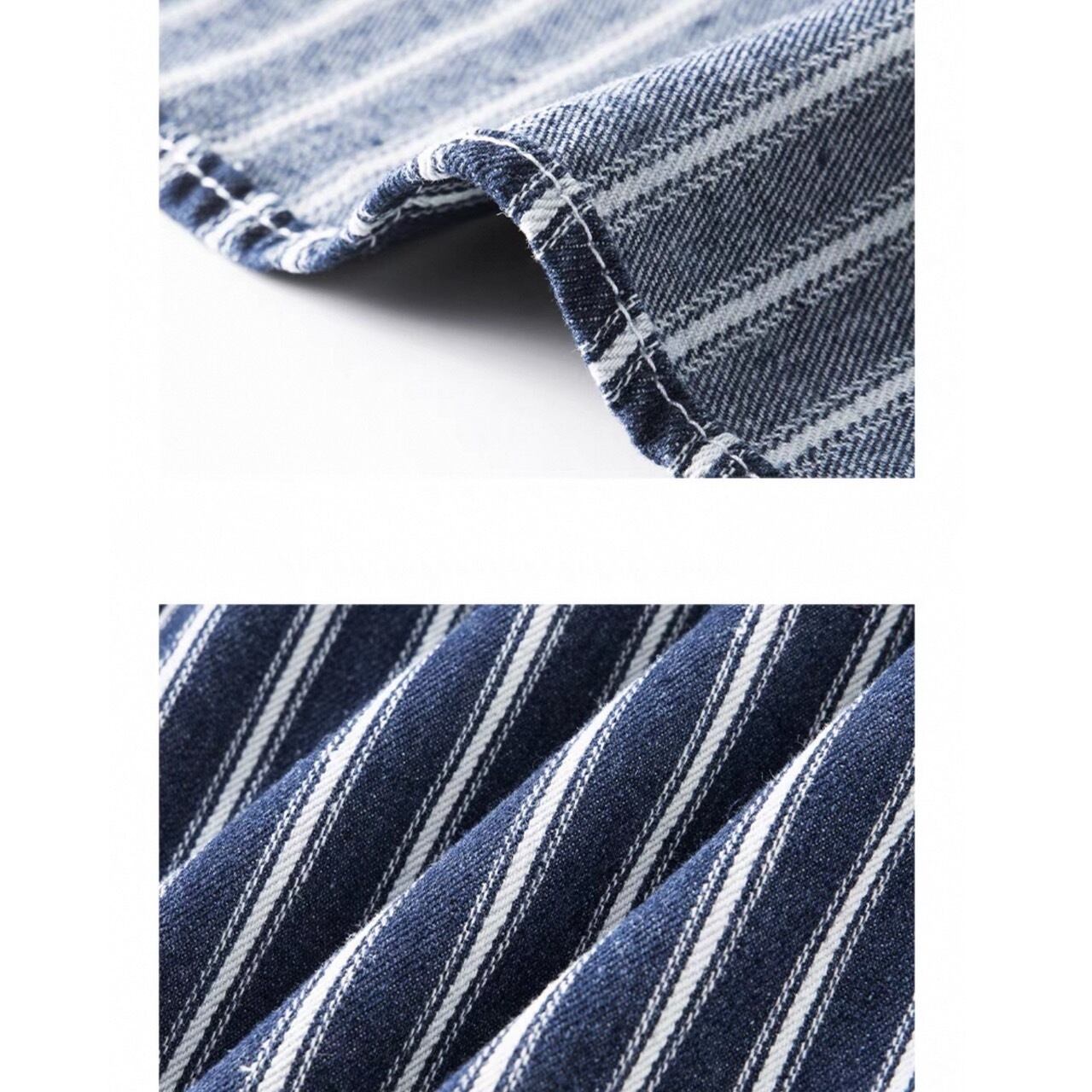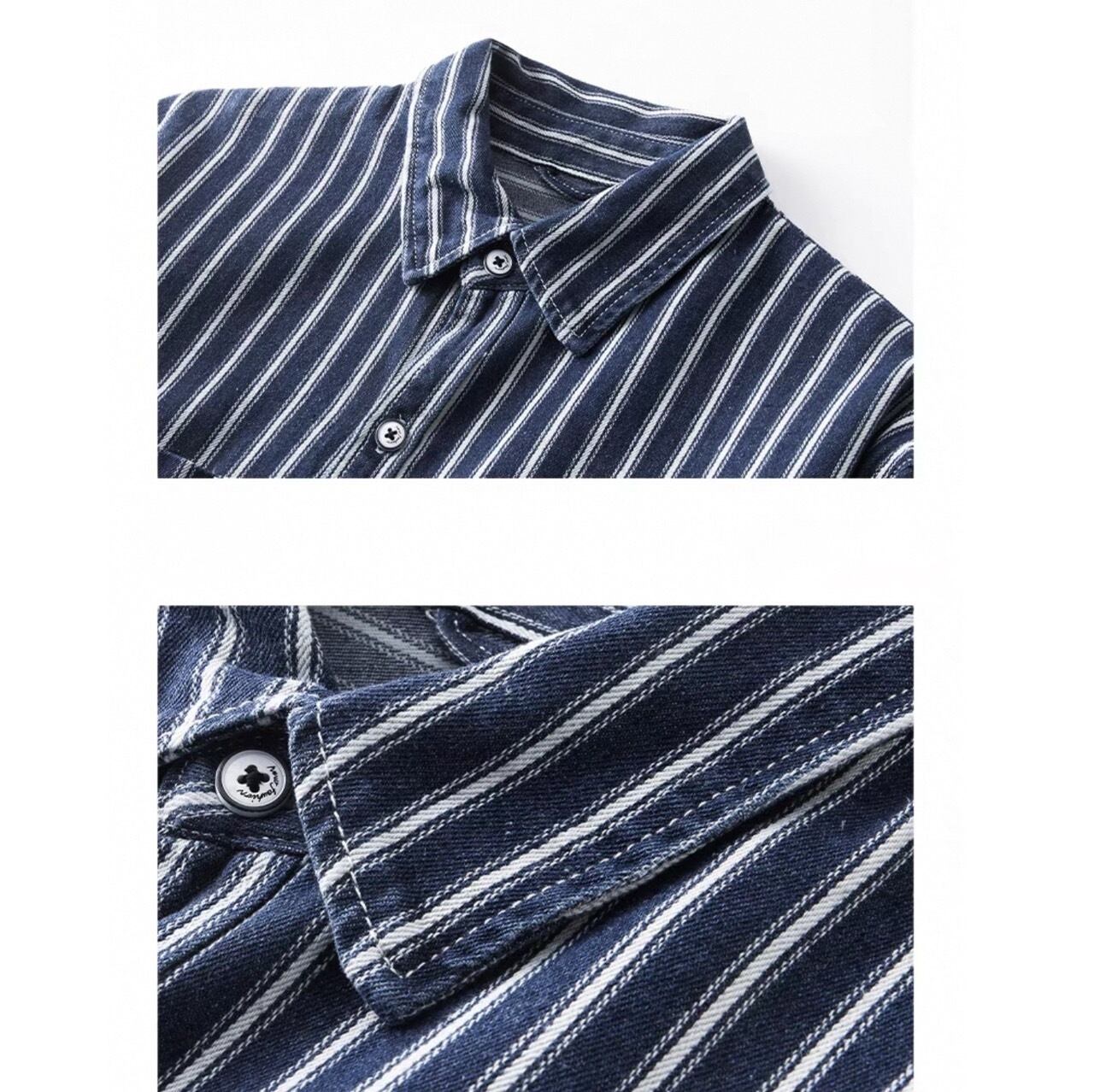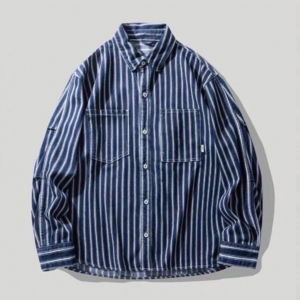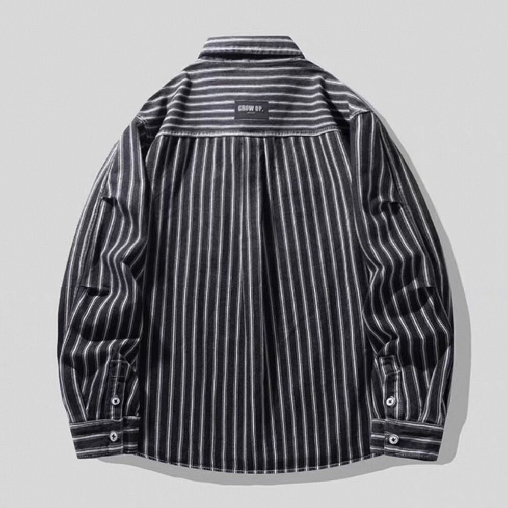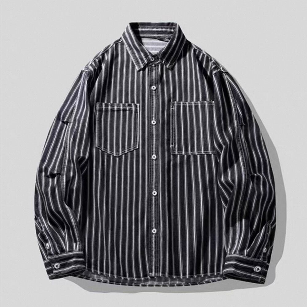 縦ストライプがスタイルをすっきりと見せる長袖ボタンダウンシャツ。