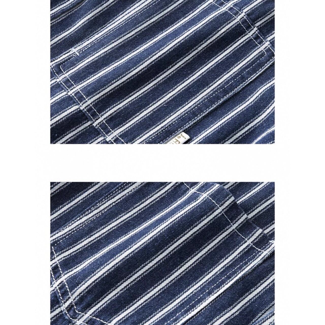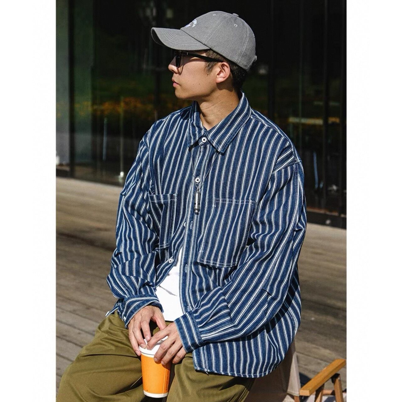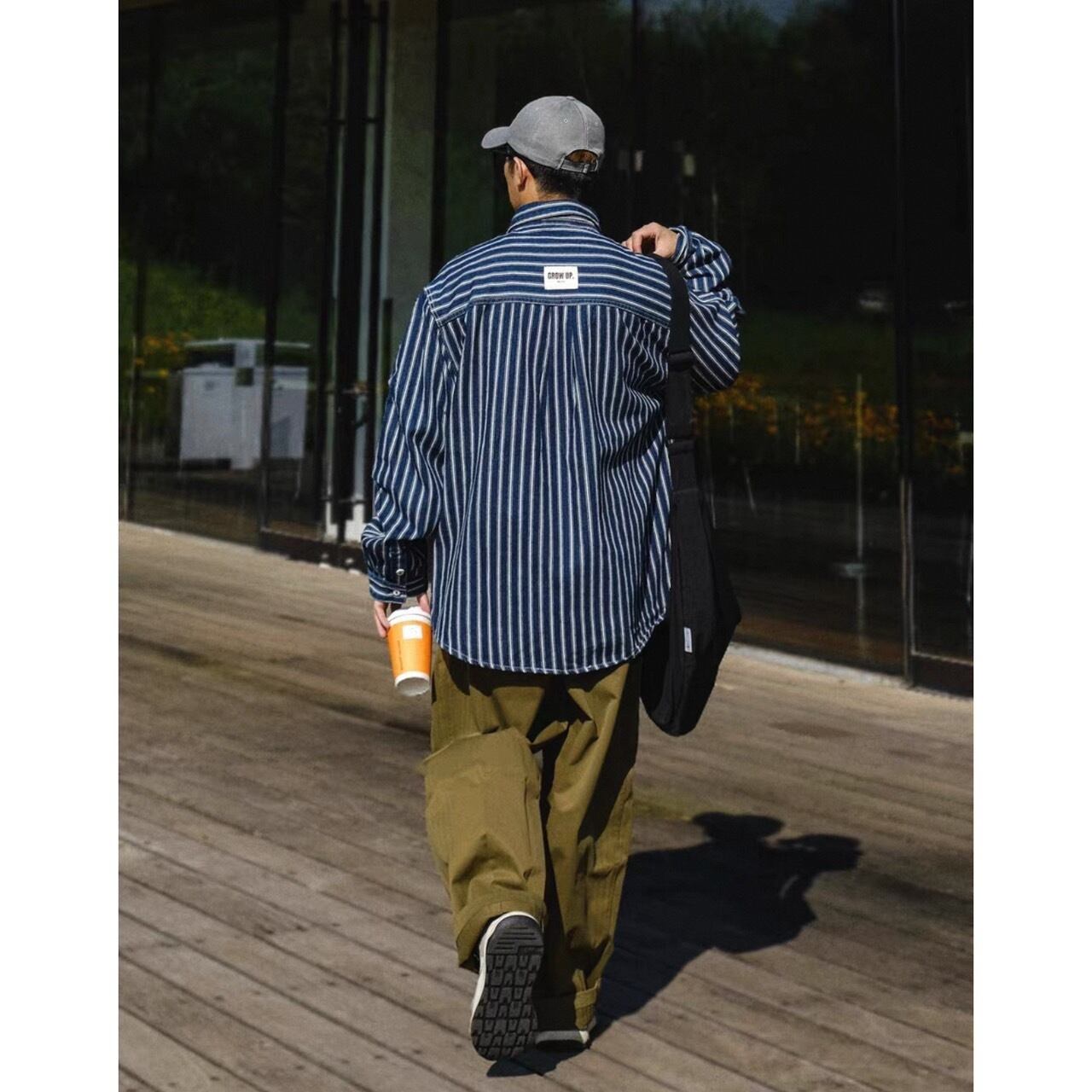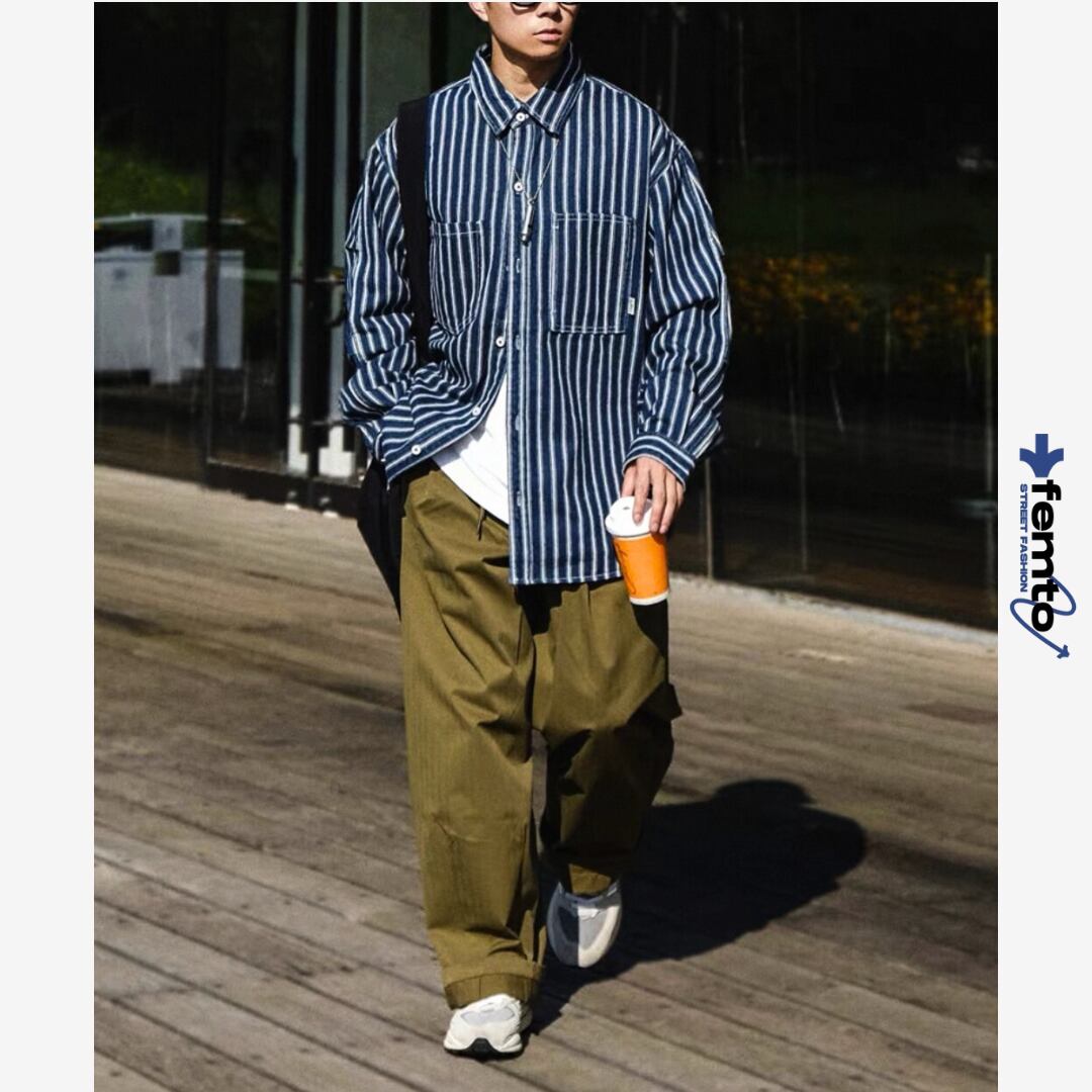縦ストライプがスタイルをすっきりと見せる長袖ボタンダウンシャツ。