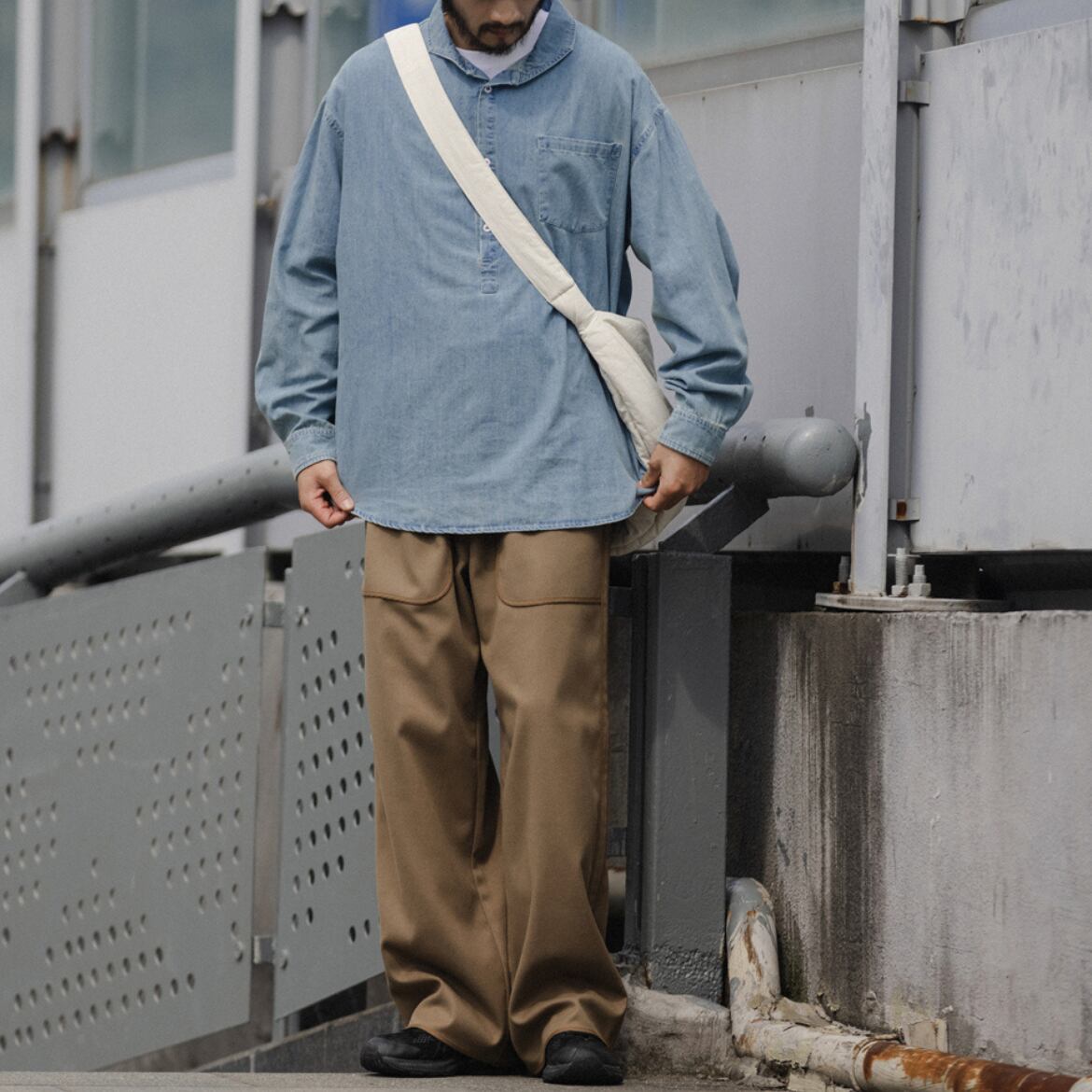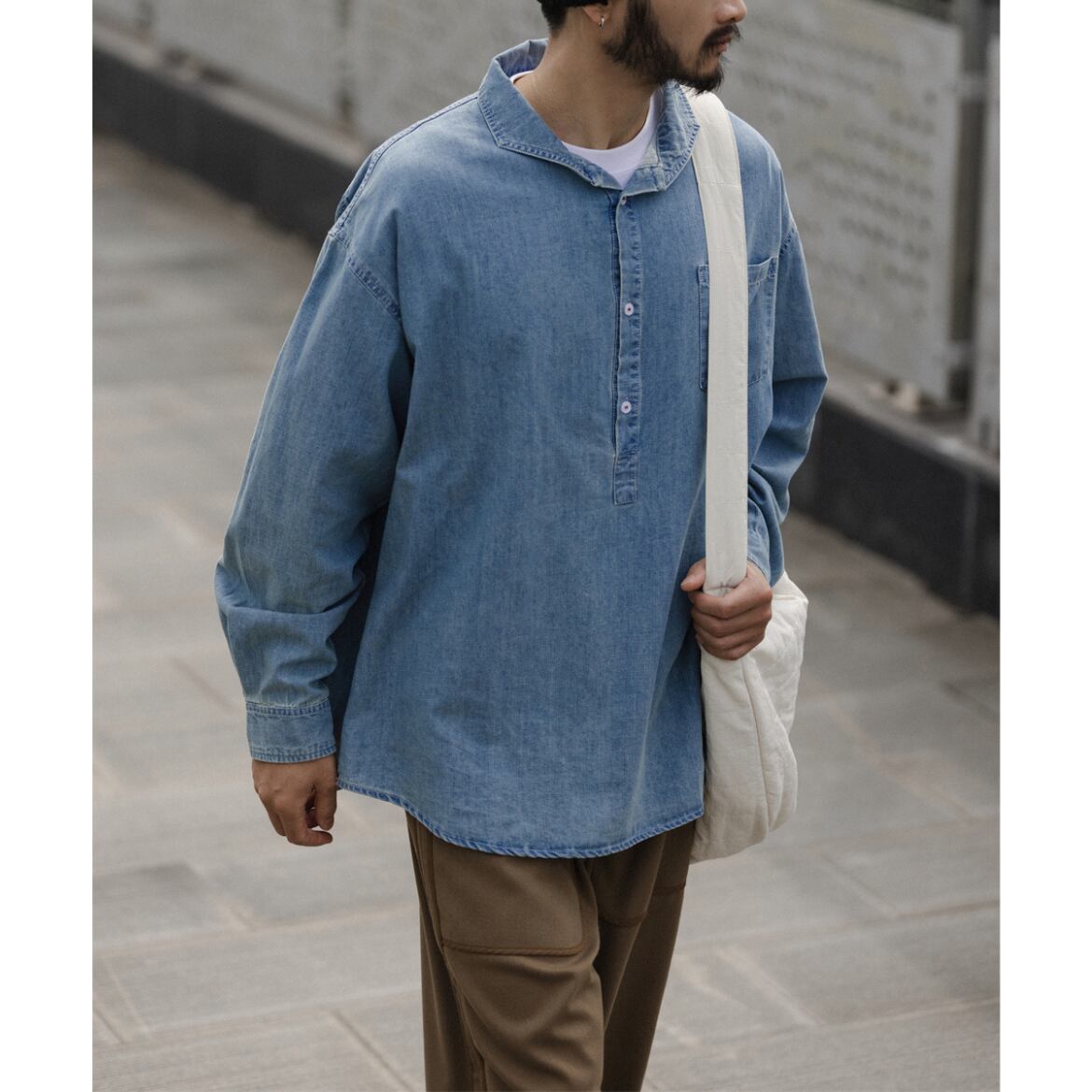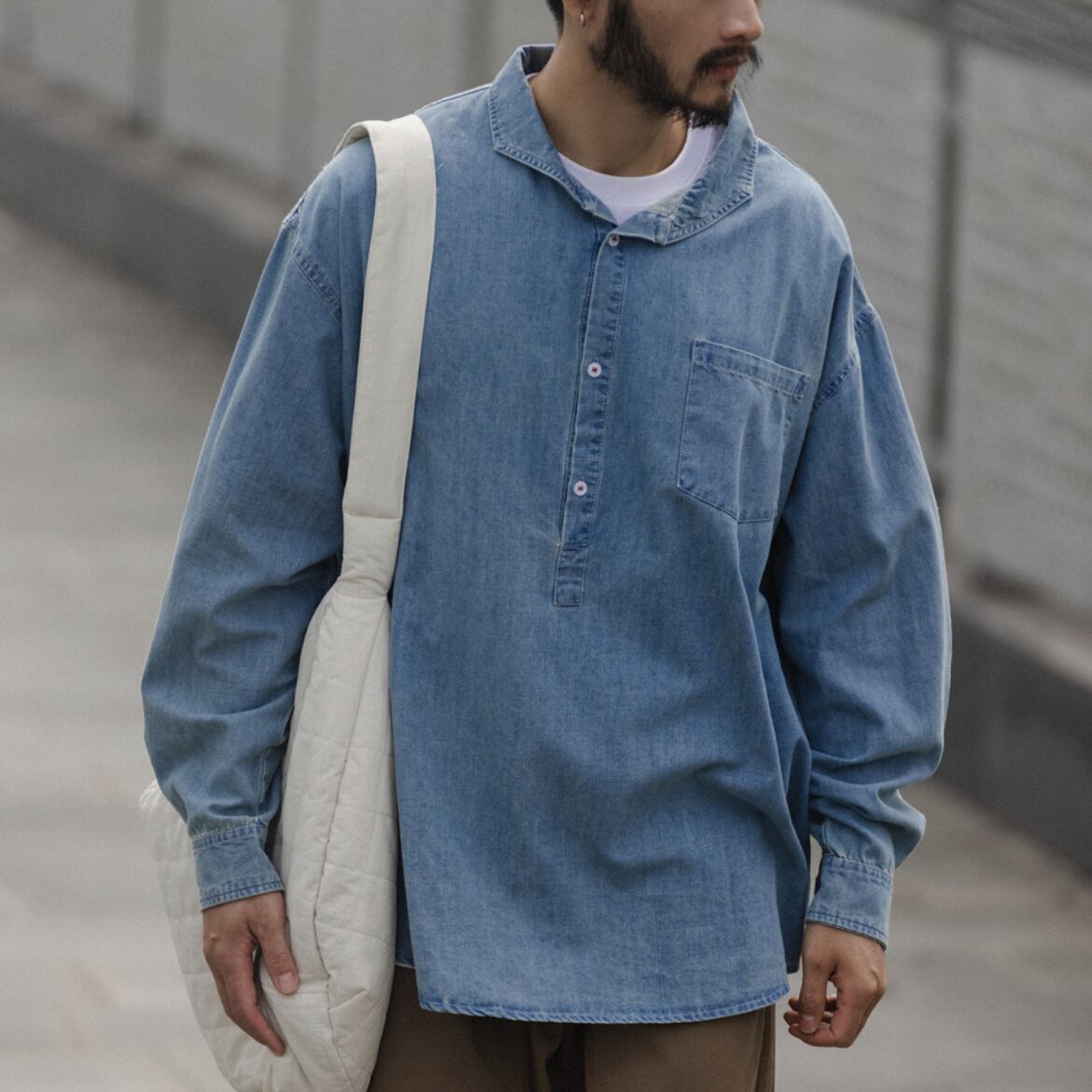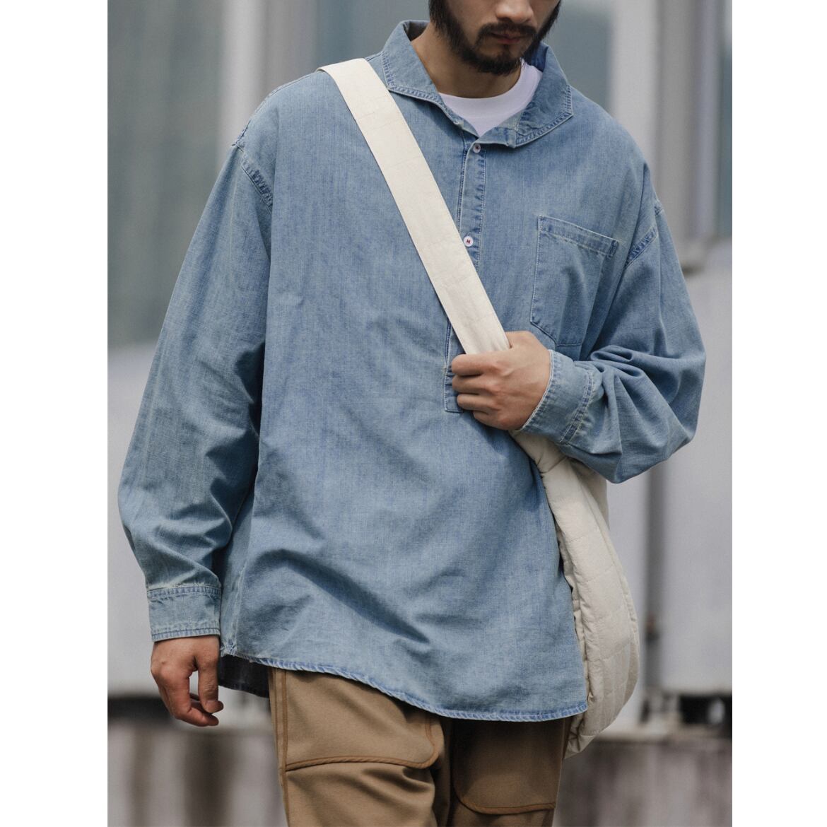 シンプルなデザインが魅力のデニムシャツ。