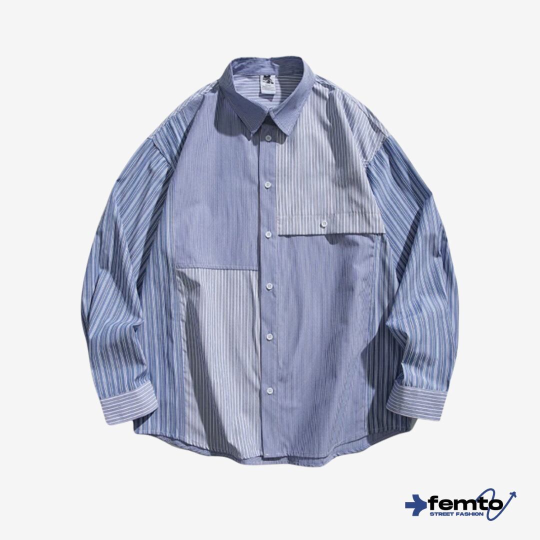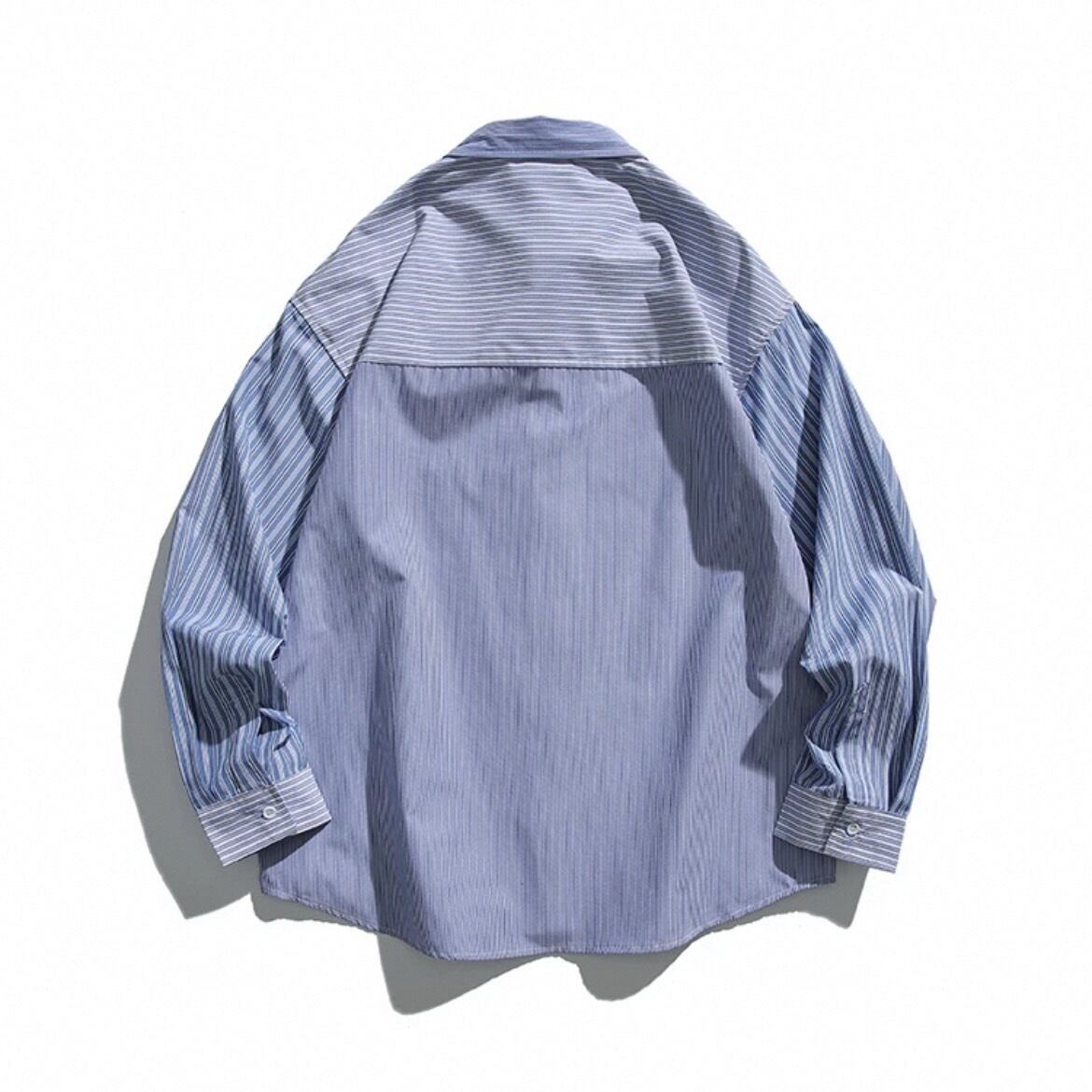 パッチワーク風のストライプ柄が目を引く、ロングスリーブシャツ。