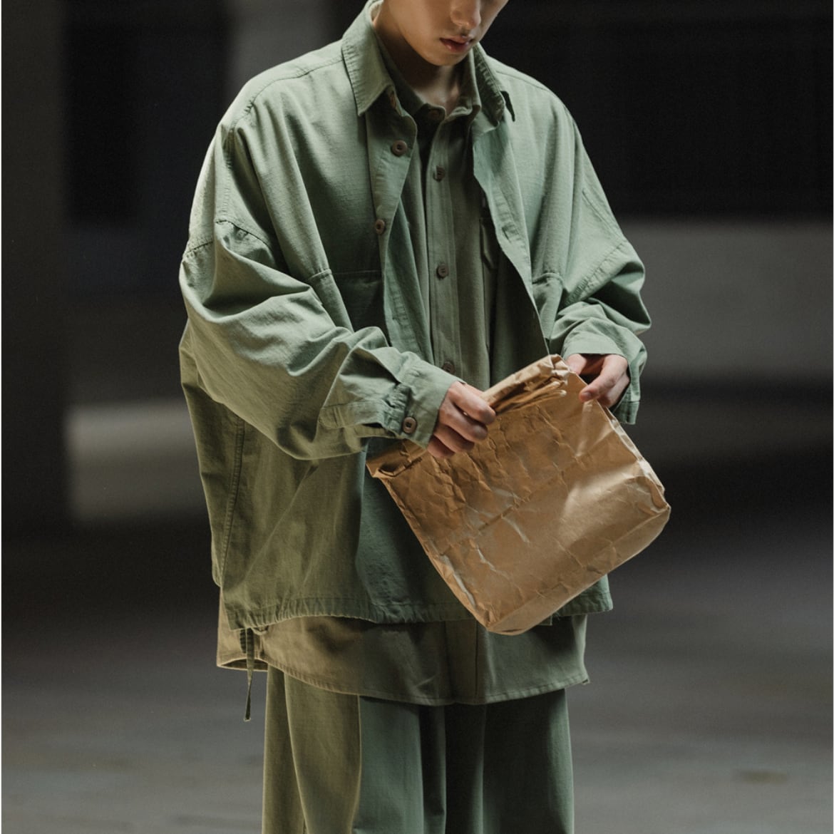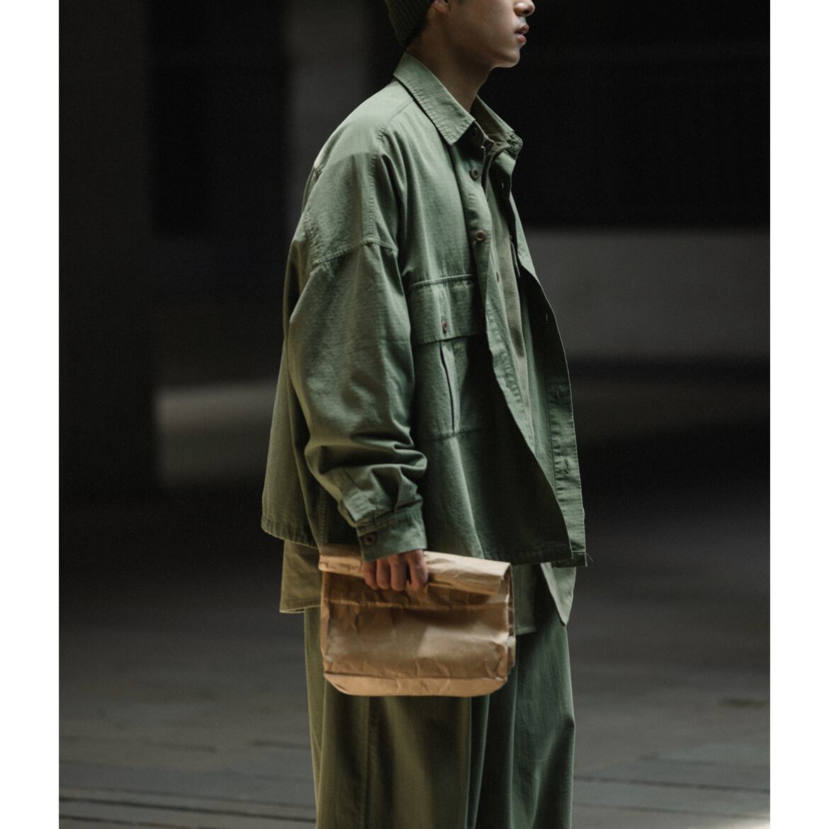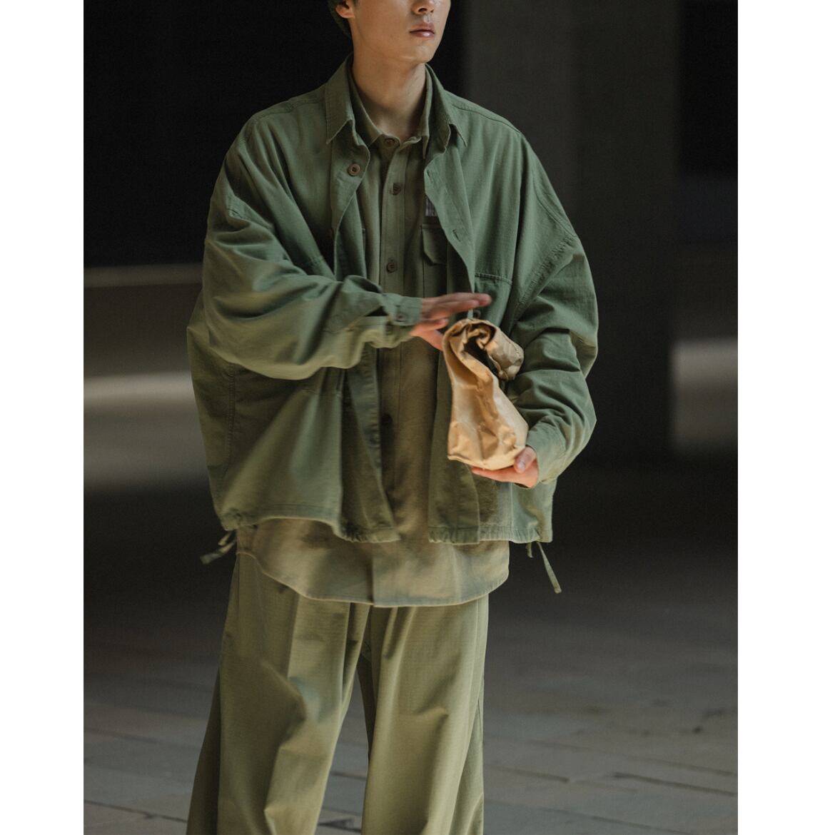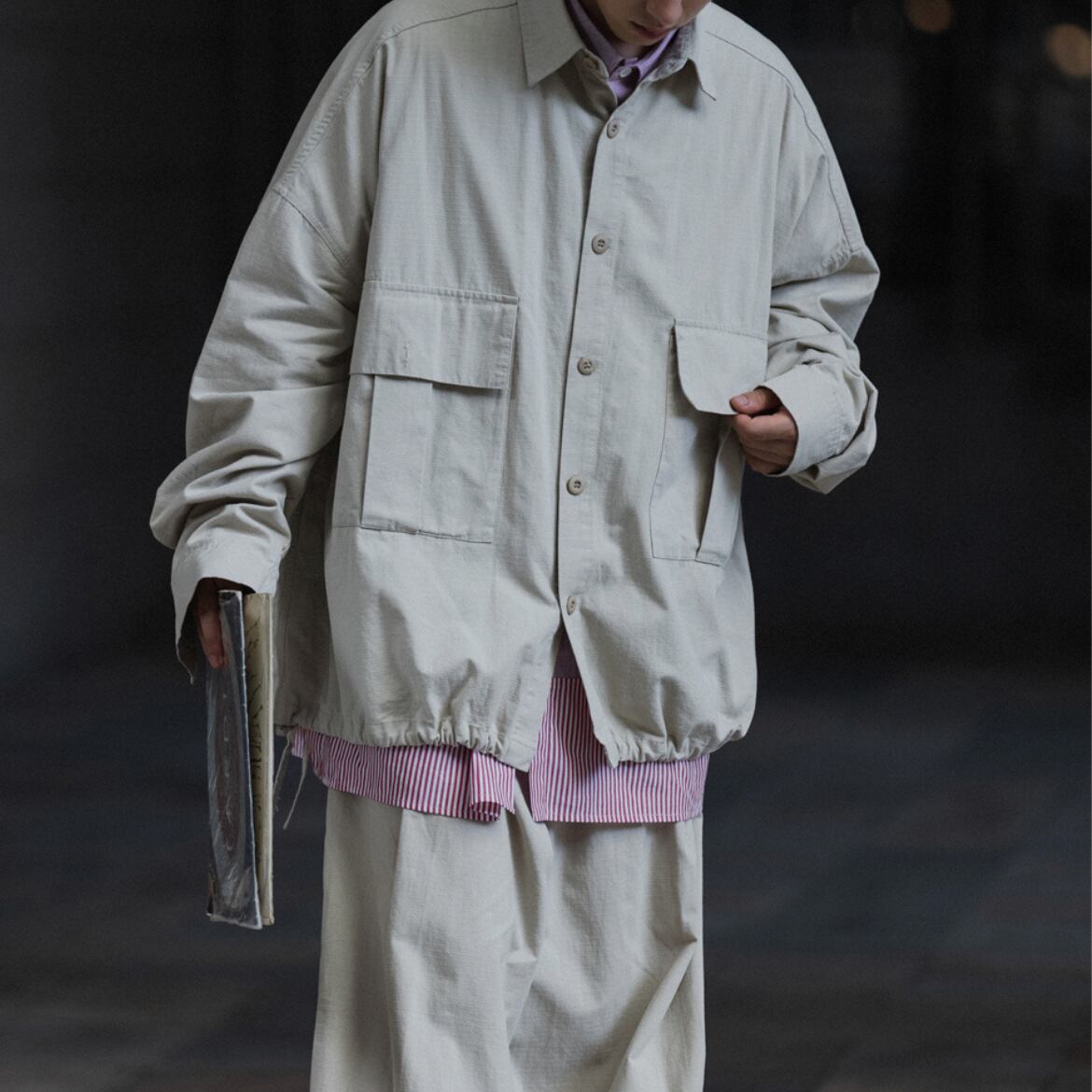 大きめのポケットとドローストリングがデザインのポイントです。