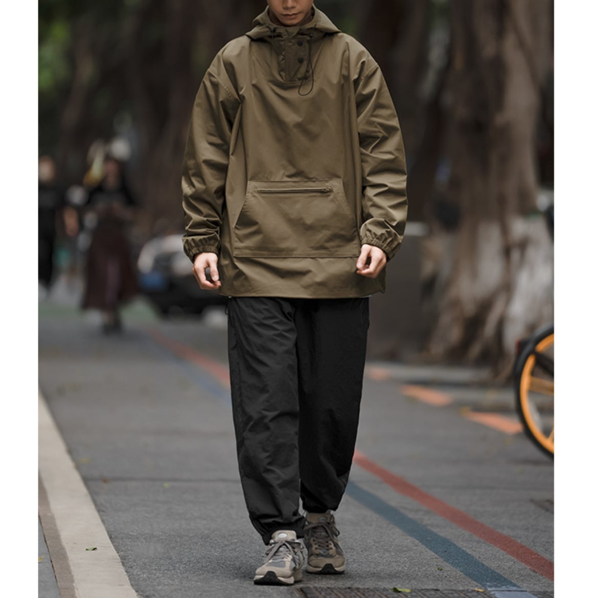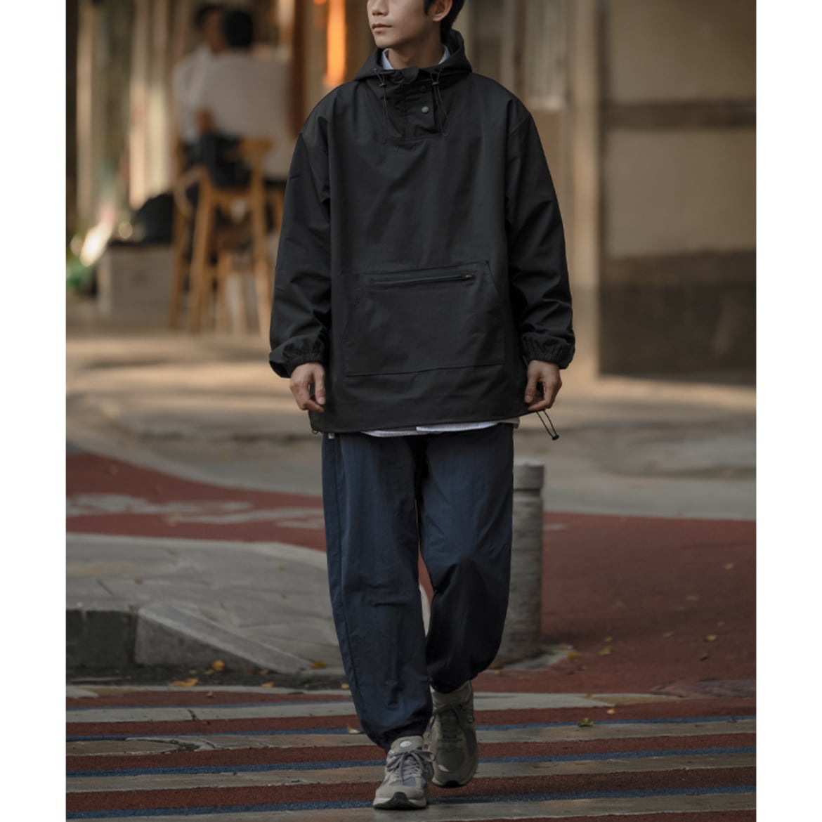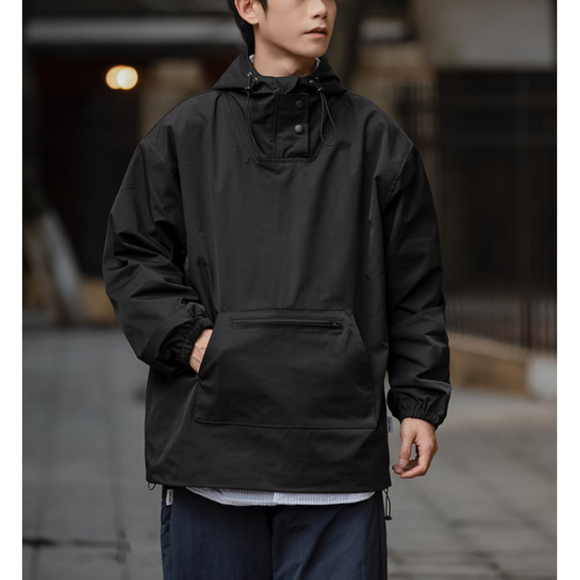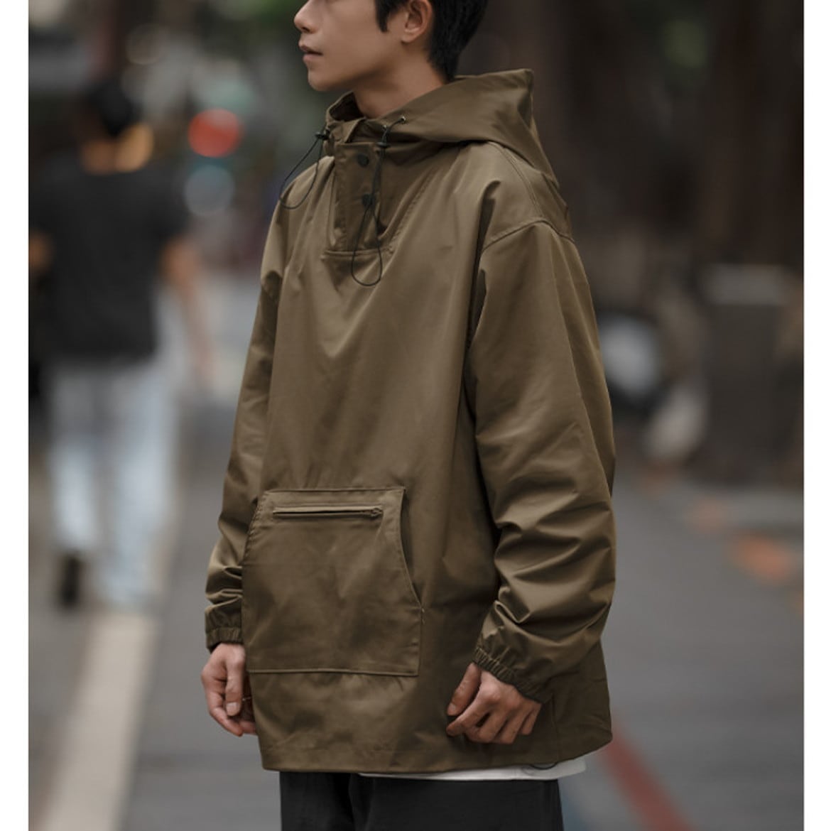 ドロップショルダーのデザインとカンガルーポケットが特徴的なプルオーバーパーカー。