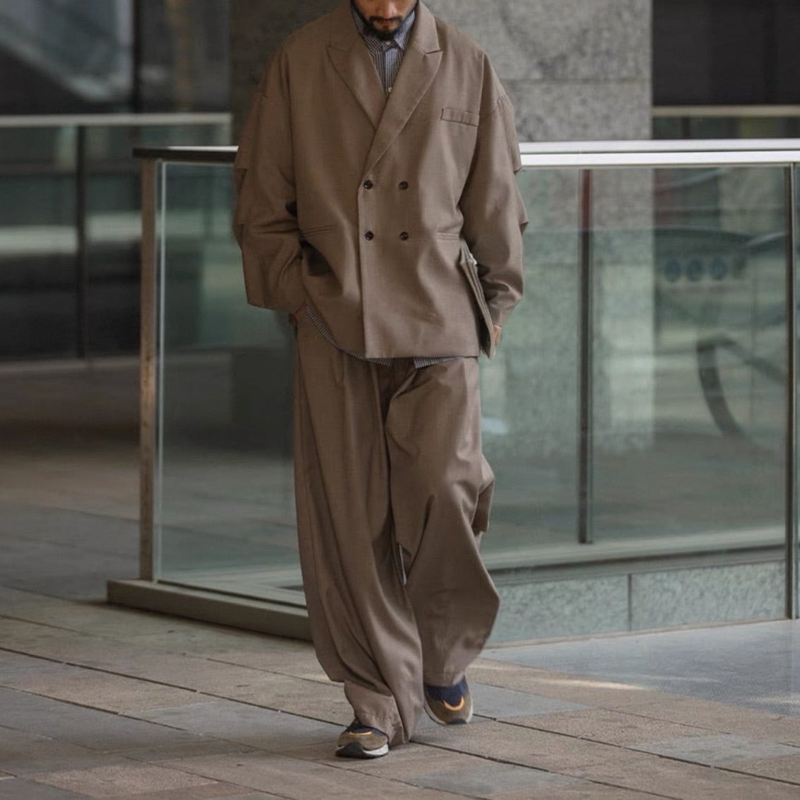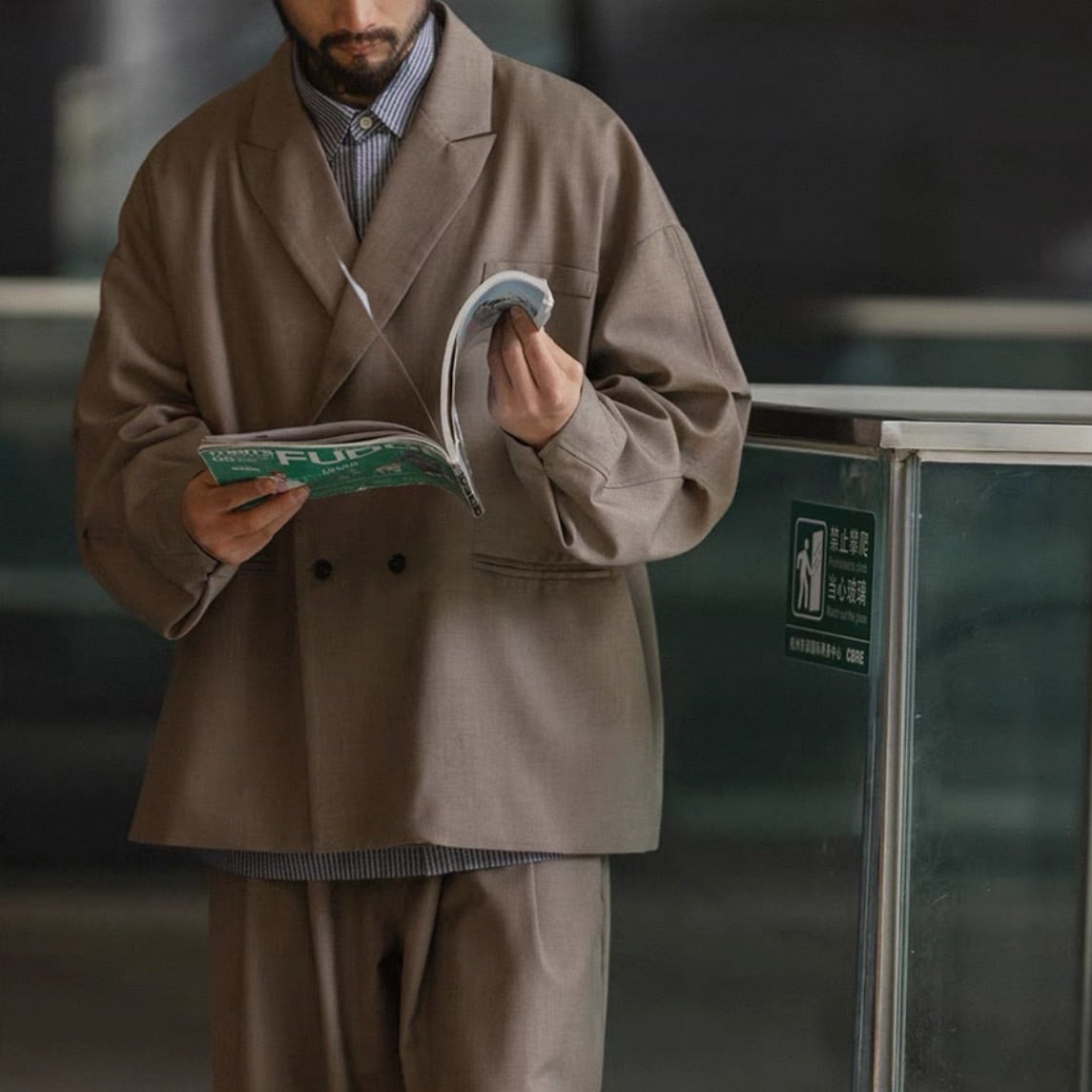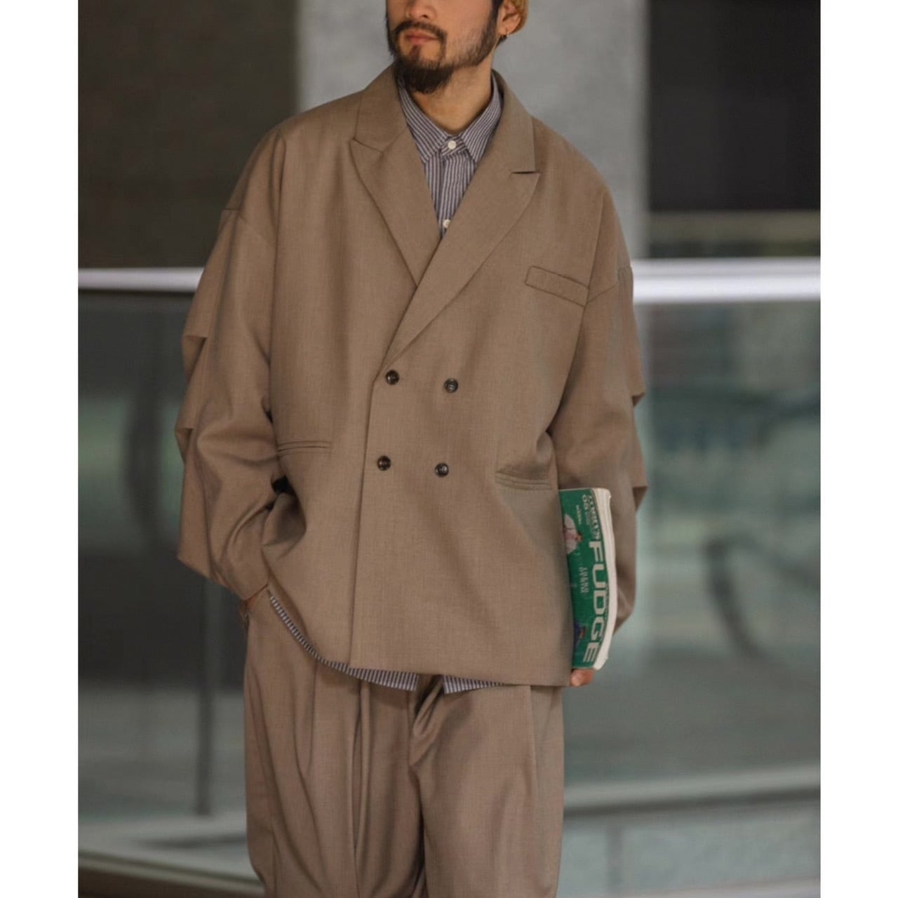 リラックス感のある着心地と、ダブルブレストのデザインが洗練された印象を与えるジャケット。