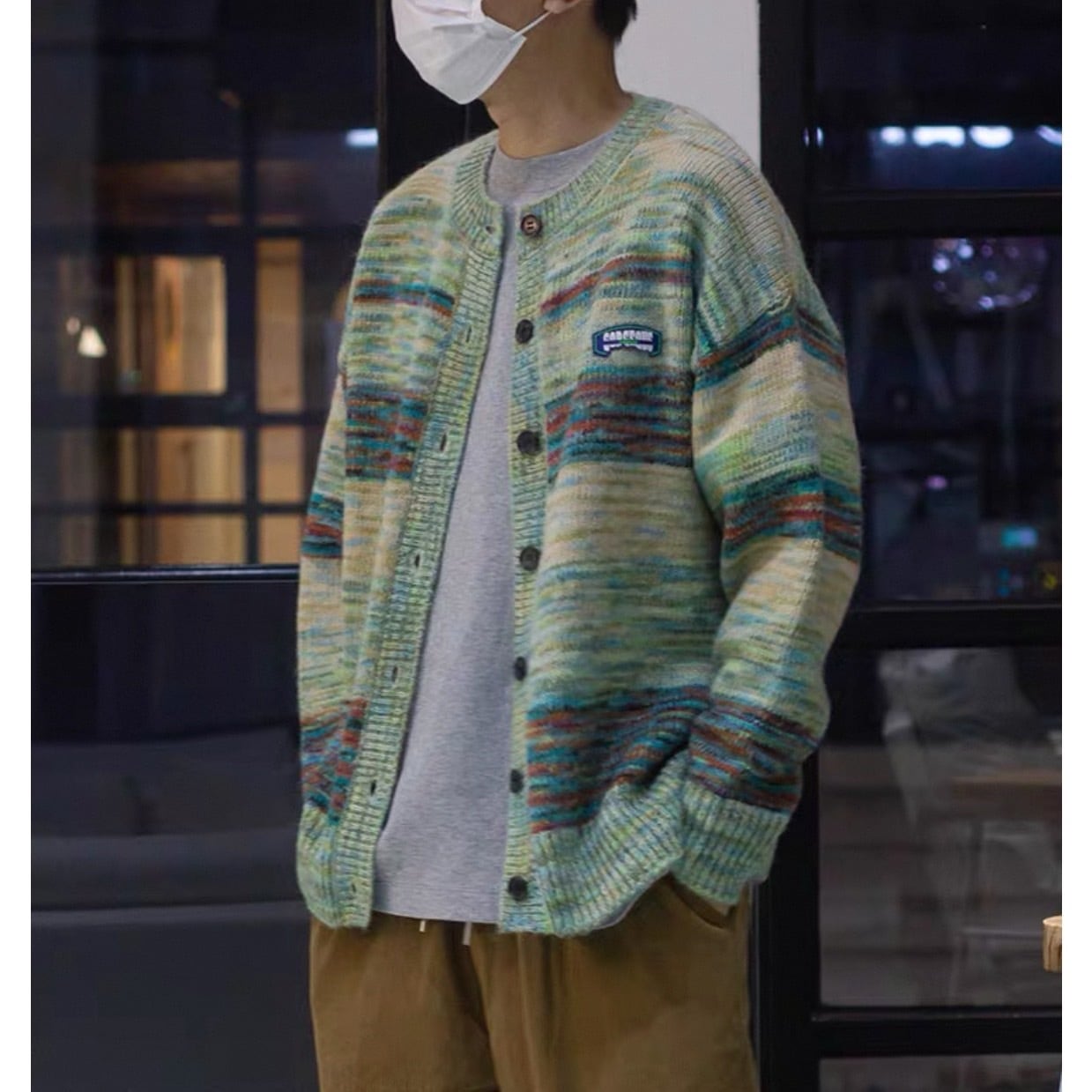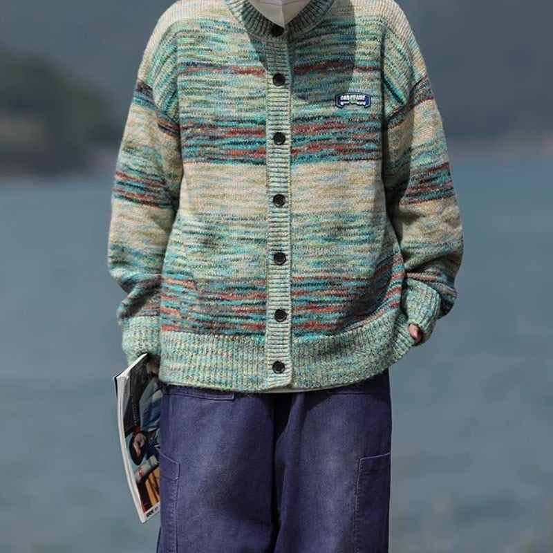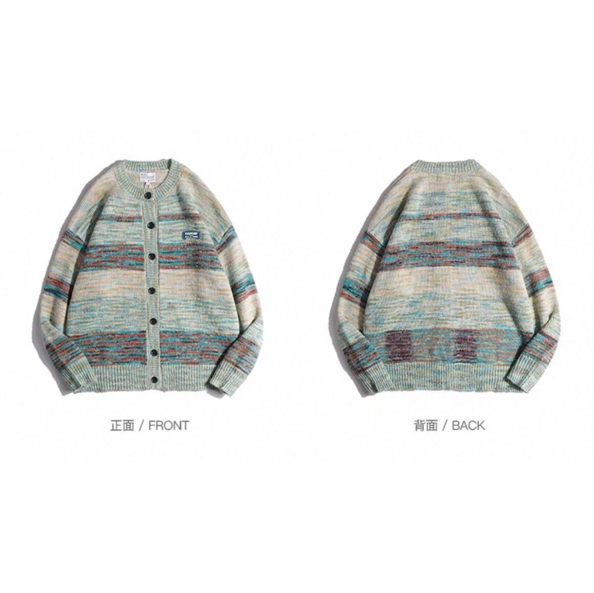 マルチボーダーが華やかなニットカーディガン。