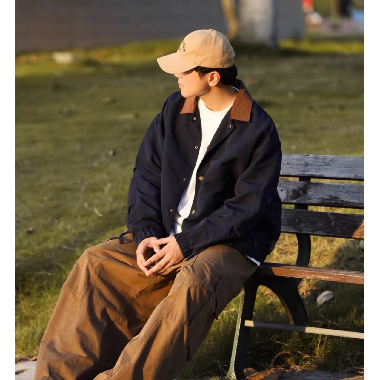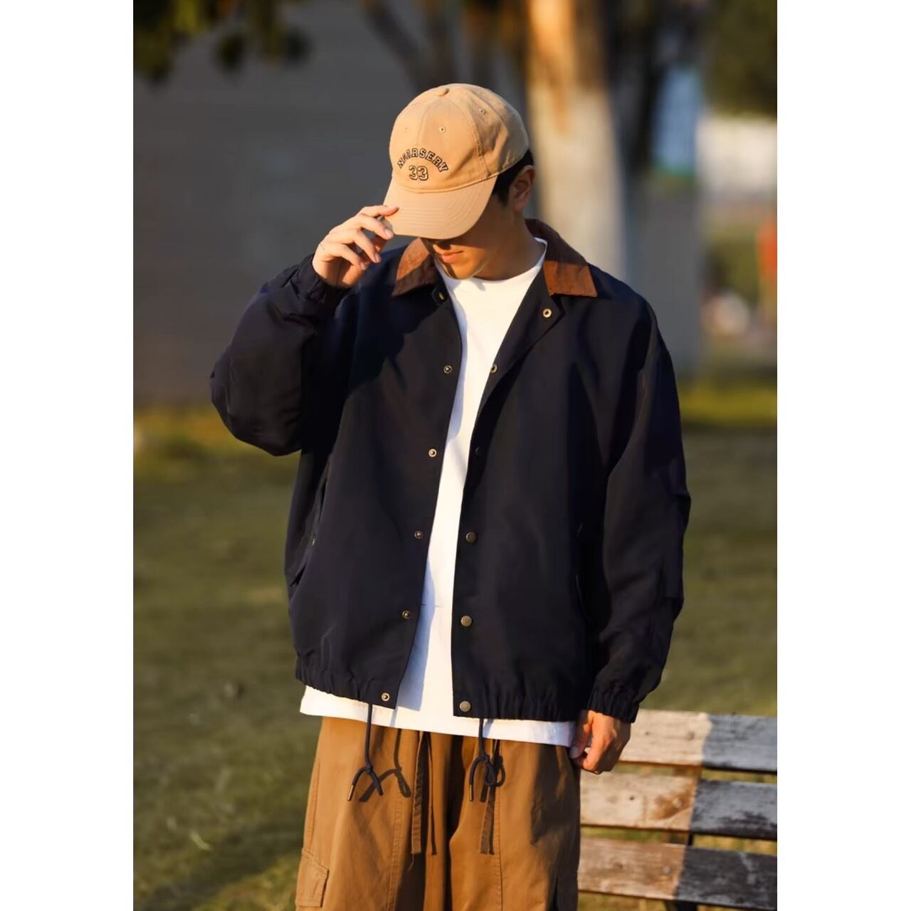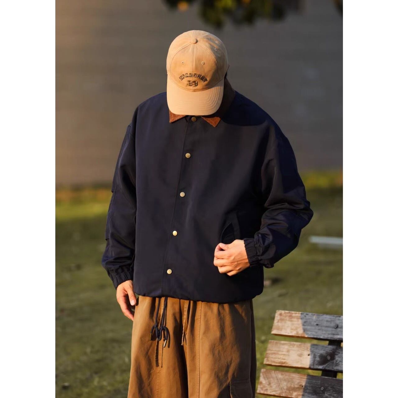 コーデュロイカラーとドロップショルダーが特徴のオーバーサイズジャケット。