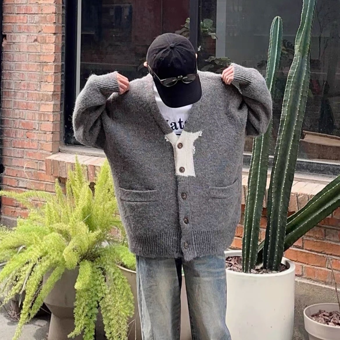 グレーとオフホワイトの組み合わせが、こなれ感と落ち着いた雰囲気を演出します。
