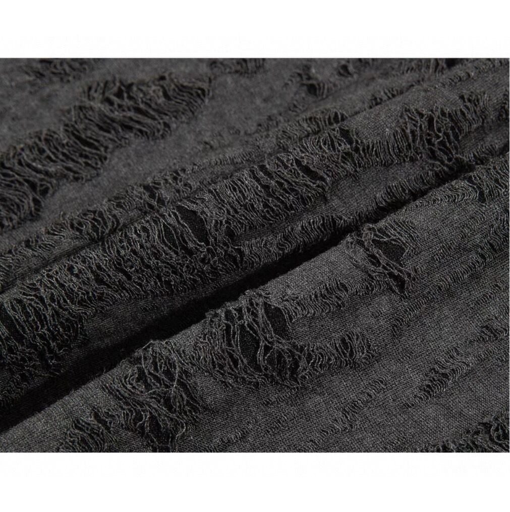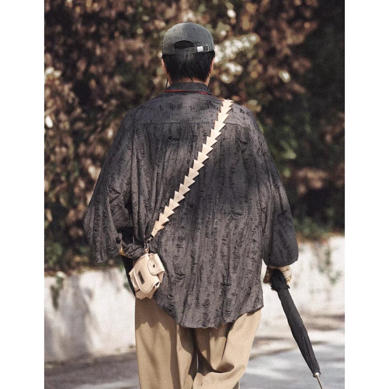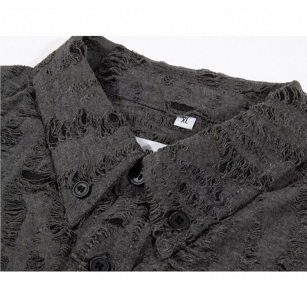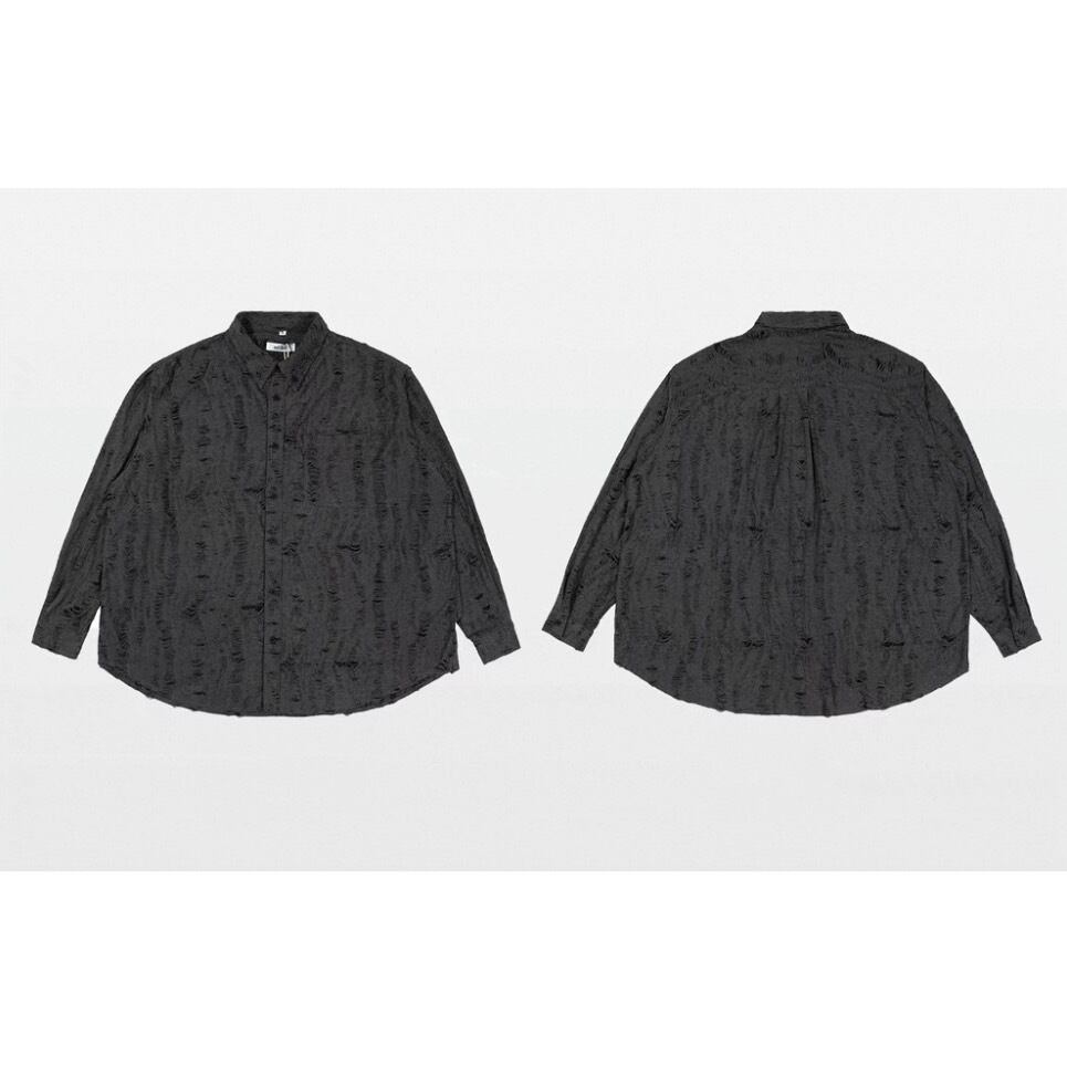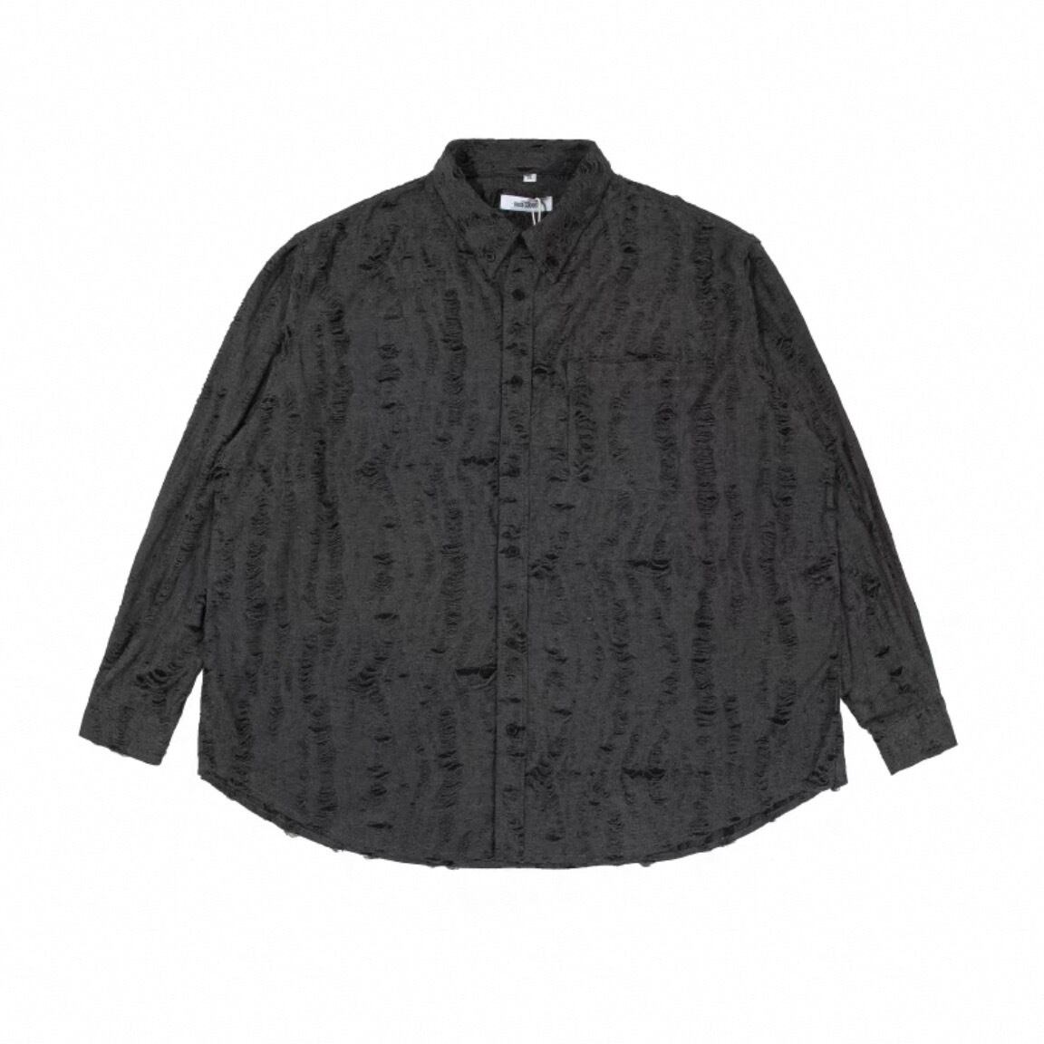 ダメージ加工が施されたオーバーサイズのロングスリーブボタンダウンシャツ。