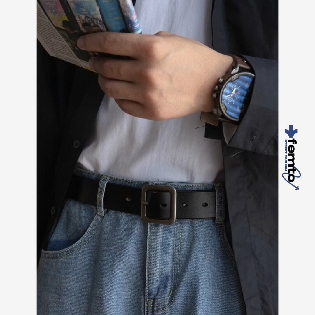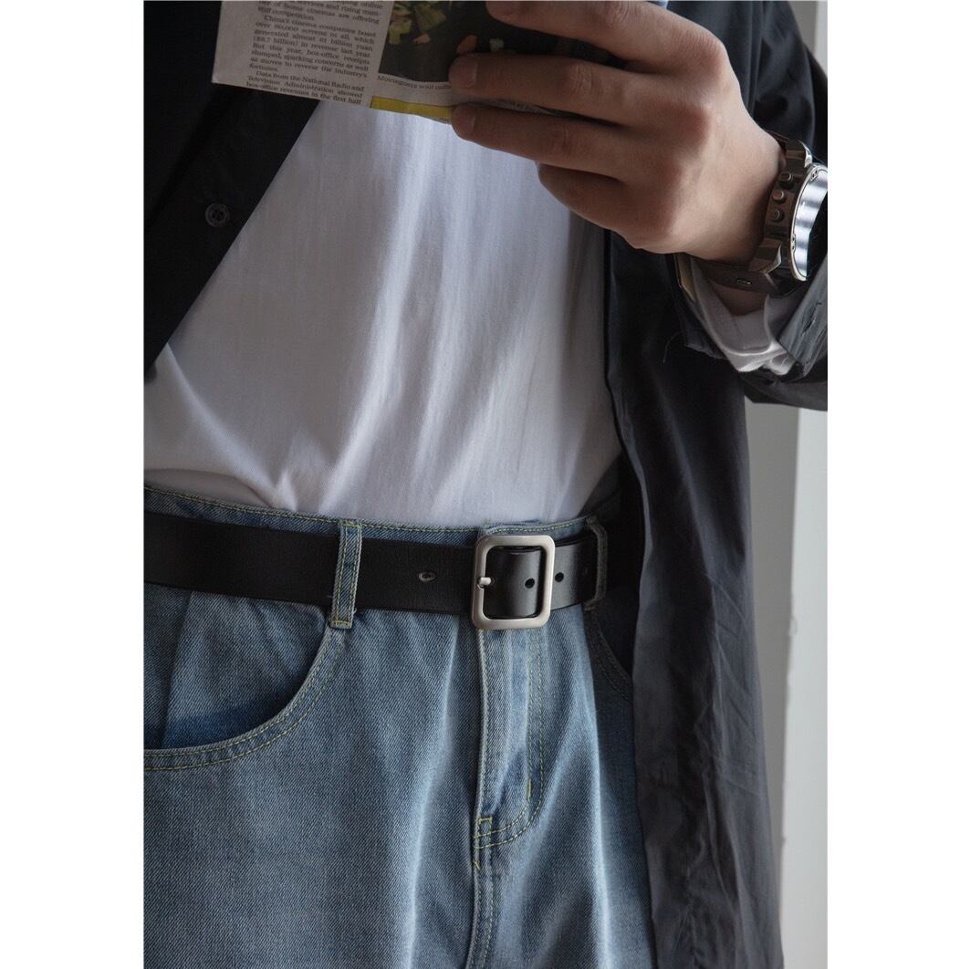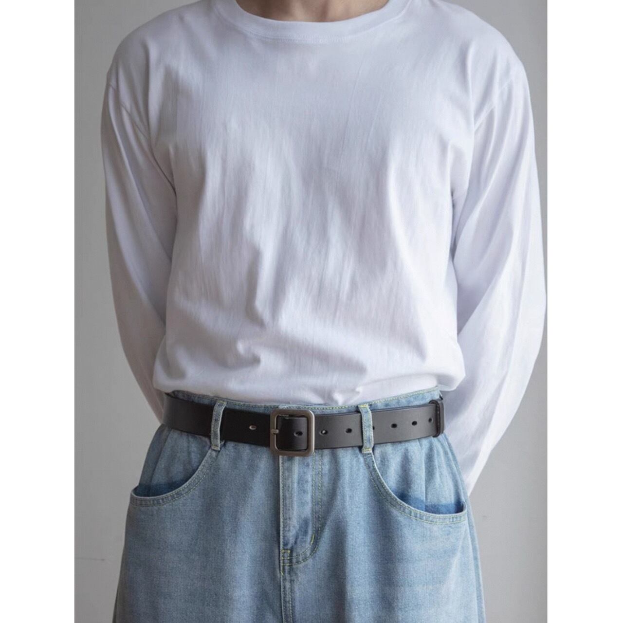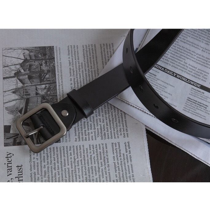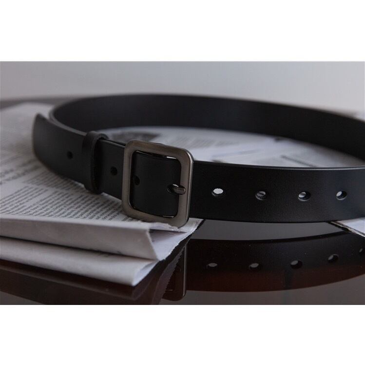 洗練されたスクエアバックルが目を引く、シンプルなレザーベルト。