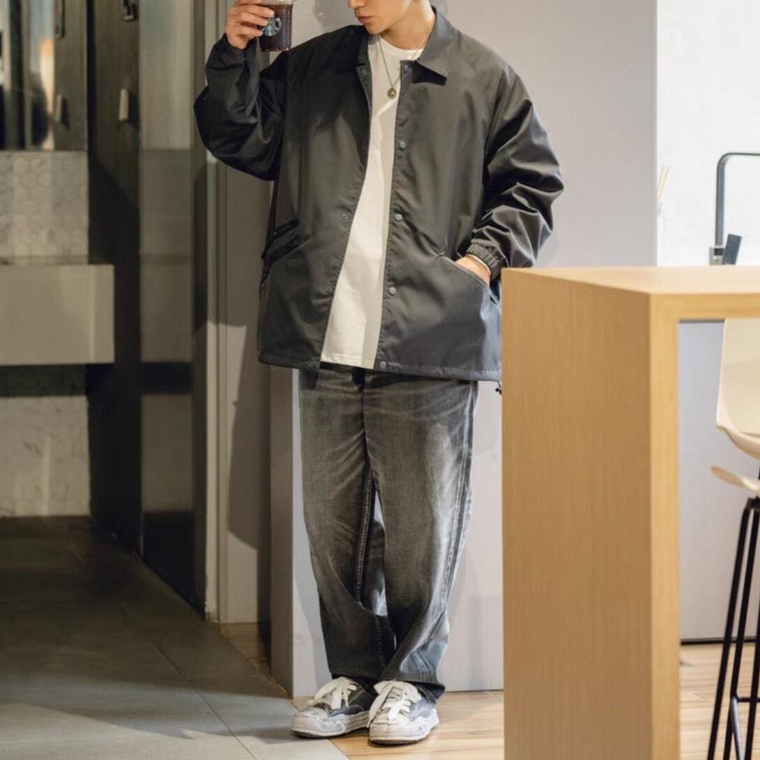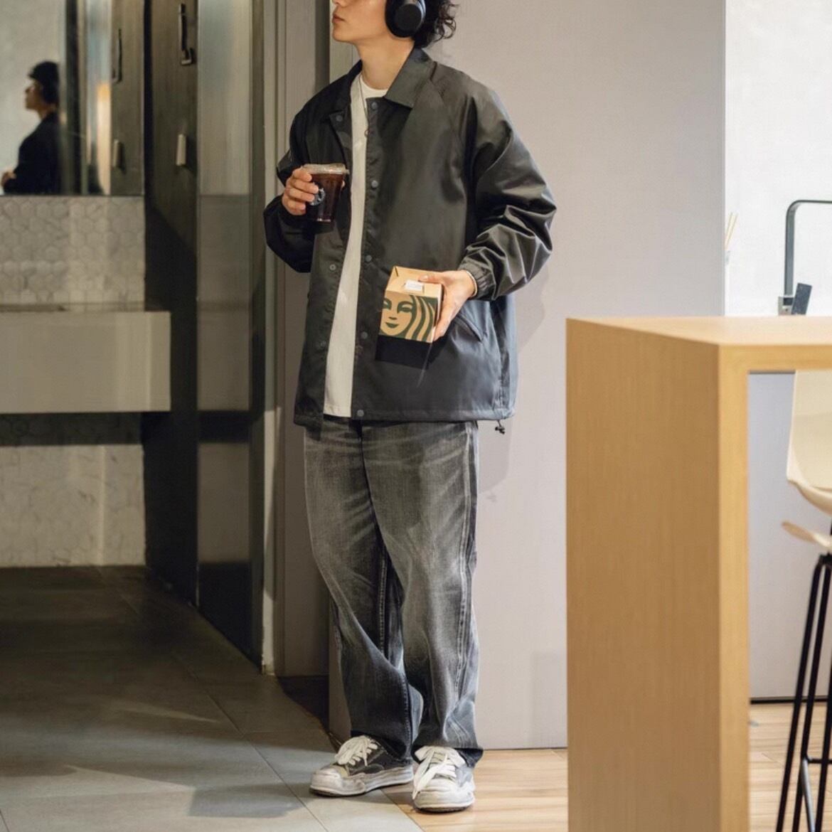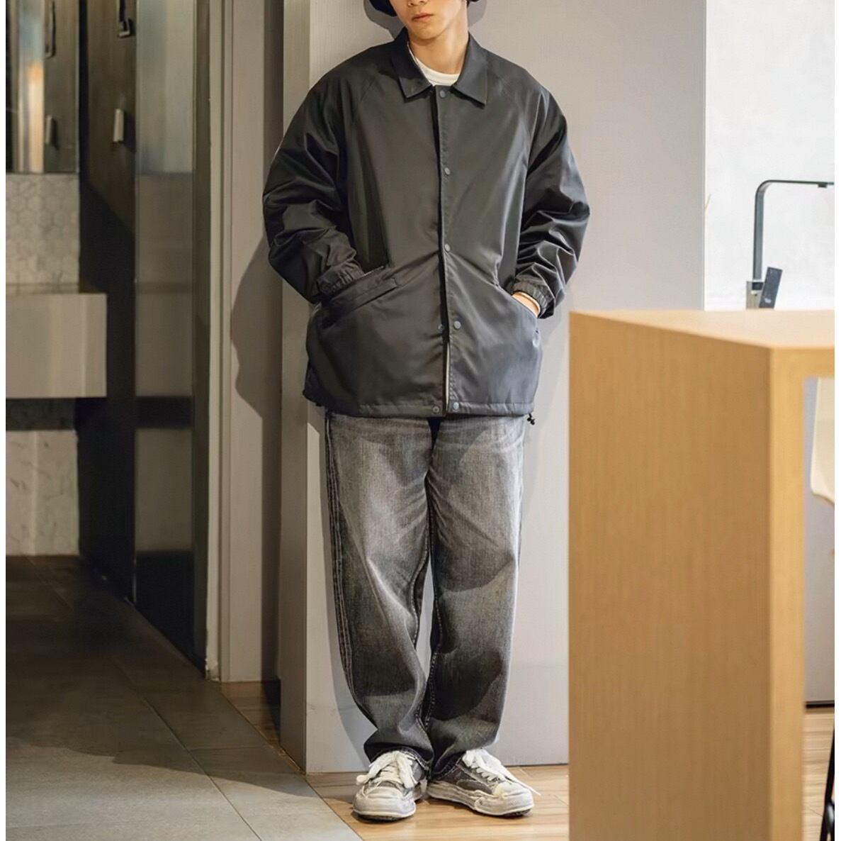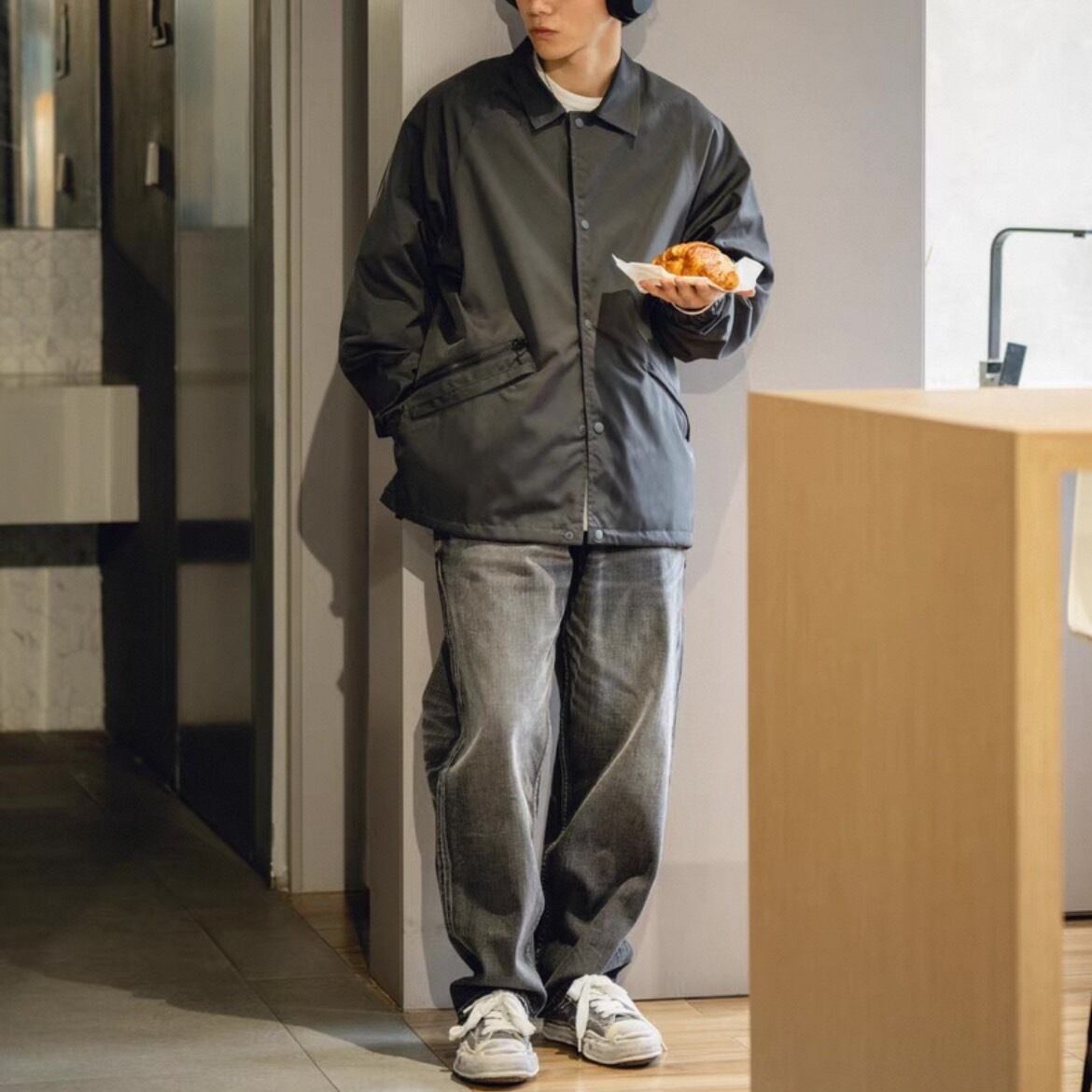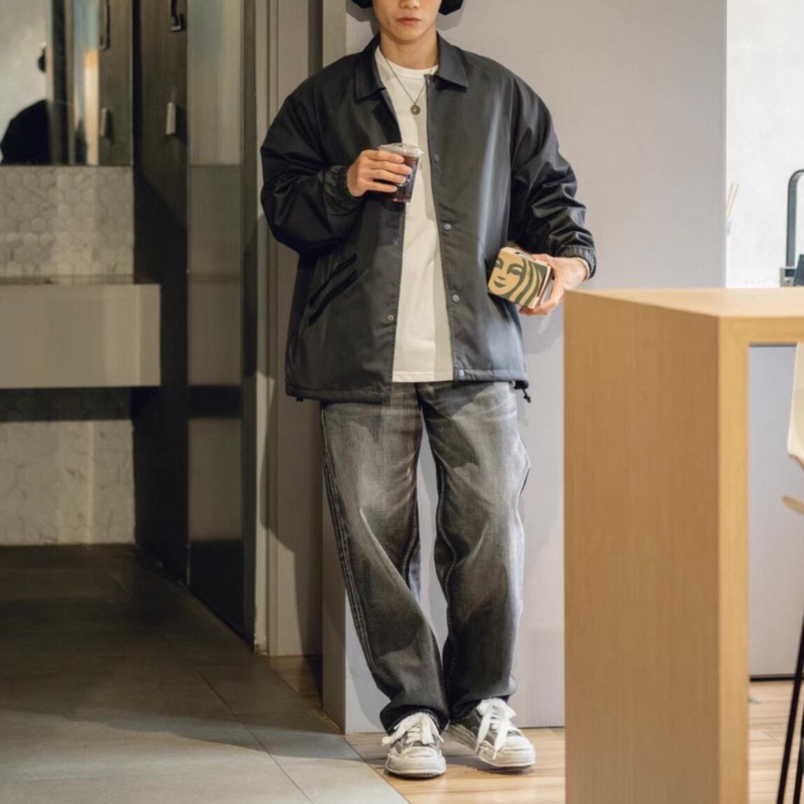 落ち着いたブラックウォッシュデニムで大人のストリートスタイルを演出。